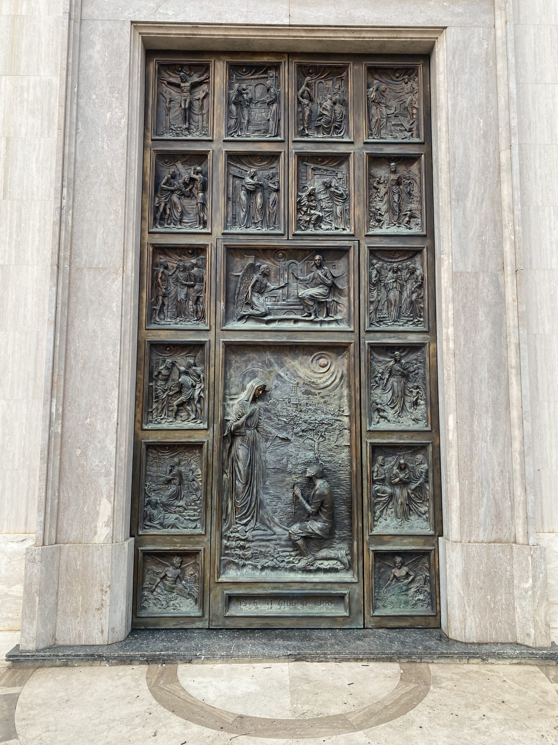 La veille, jour de la solennité de la Pentecôte, une terrible tempête de grêle s’était abattue sur toute la région de Casalbordino, dévastant les récoltes. Le lendemain, après la fin de l’orage, Alessandro se rendit dans la région de Casalbordino, plus précisément à Pian del Lago, pour inspecter l’état de son champ de blé. Arrivé à l’emplacement actuel du sanctuaire, tout en récitant le rosaire, il entendit la cloche de l’église paroissiale de Casalbordino sonner, annonçant la consécration de l’Eucharistie, et il s’agenouilla en adoration. À cet instant précis, baignée d’une lumière éclatante, la Vierge lui apparut. La Vierge parla à l’homme agenouillé à ses pieds, le rosaire à la main. La Vierge désigna le péché humain comme la cause de la tempête désastreuse de la veille. » Elle assura au vieil homme que son champ avait été épargné par la grêle et lui confia un message pour le curé de Pollutri, l’exhortant à prêcher le troisième commandement : « Souviens-toi de sanctifier la fête. » À la fin du message, la Madone disparut, laissant le sol où elle se tenait sec.